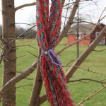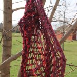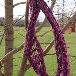 This is a open net infinity scarf that can be worn multiple ways. Lightweight enough to wear even when it’s warmer out. The yarn has a silky feel to it with sequins worked in. Total circumference is roughly 60 inches. Width is roughly 15 inches.